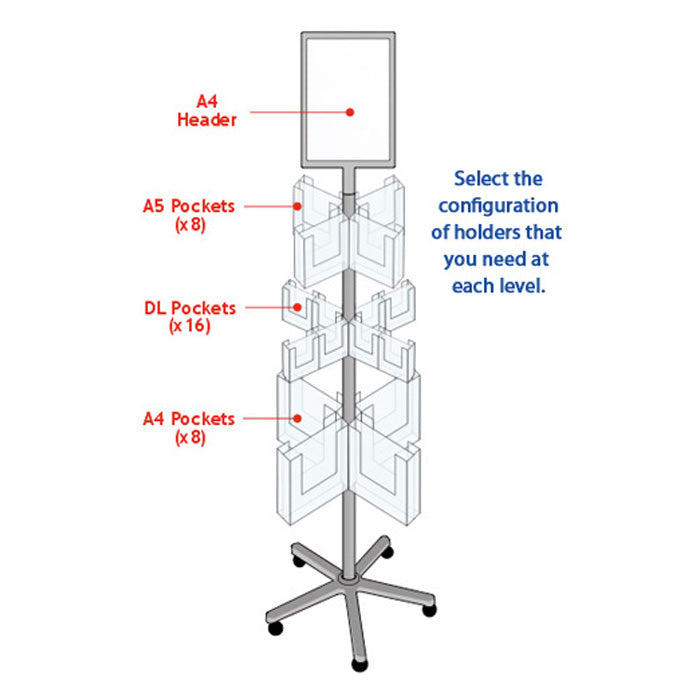The multi-tier revolving brochure holder accommodates various publication sizes. In fact, you can choose from DL, A5, or A4 holder sizes to match your exact needs. Because of this flexibility, you can display everything from small flyers to full-size catalogs on the same stand.